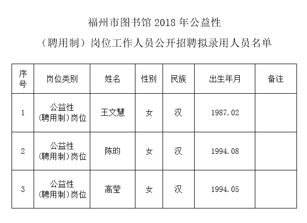 福州市图书馆第十七批公益性 (聘用制)岗位拟录用人员名单的公示