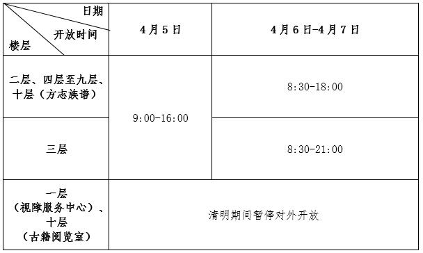 根据国务院办公厅《关于2019年部分节假日安排的通知》精神,结合本馆服务工作的实际情况,福州市图书馆2019年清明期间开放时间安排如下: